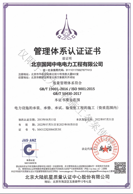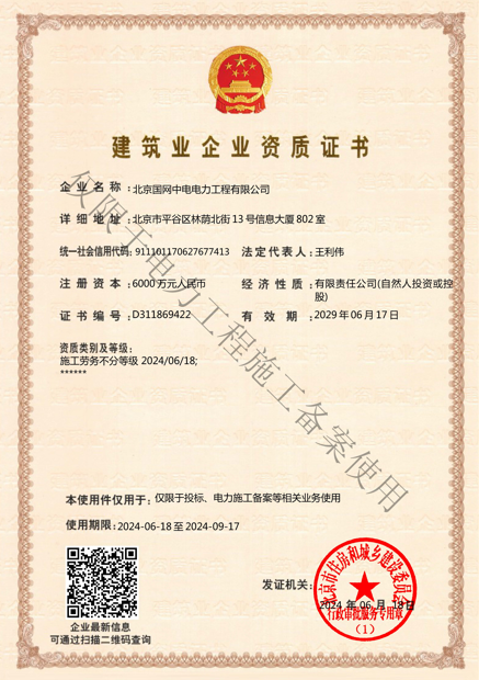 北京國(guó)網(wǎng)中電電力工程有限公司,已取得國(guó)家電監(jiān)會(huì)頒發(fā)的《承裝(修、試)電力設(shè)施許可證》、為電力施工承裝四級(jí)、承修四級(jí)、承試四級(jí)企業(yè)。北京市住房和城鄉(xiāng)建設(shè)委員會(huì)頒發(fā)的房屋建筑施工總承包二級(jí)、機(jī)電設(shè)備安裝工程專業(yè)承包二級(jí)、輸變電專業(yè)承包二級(jí)、城市及道路照明工程專業(yè)承包二級(jí)、市政公用工程總承包二級(jí)資質(zhì)、勞務(wù)不分等級(jí),已通過ISO9001:2015 GB/T50430-2017質(zhì)量管理體系、GB/T24001-2016/ISO 14001:2015環(huán)境管理體系、